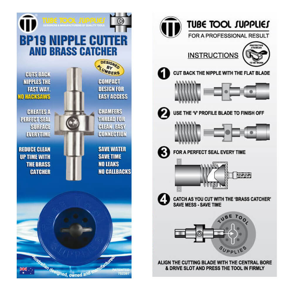 Our new and improved BP19 Carbide Nipple Cutter & Brass Swarf Catcher cuts all 1/2 inch brass fittings and new lead-free fittings for a secure and leak-free connection to flexi cone and flat seat flexible connectors.